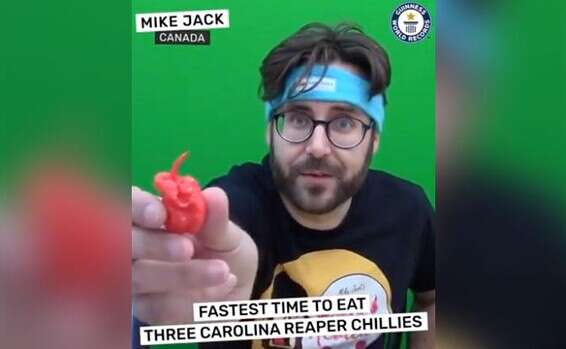 בחזרה למייק ג'ק הקנדי. הוא שבר את שיא גינס העולמי לאכילת הכמות הגדולה ביותר של אותו מלאך מוות מקרולינה בהכי מעט זמן. שלושה פלפלים ב9.72 שניות. השיא הלא פחות ממטורף הזה פורסם בדף הפייסבוק הרשמי של גינס וכהוכחה גם צורף הסרטון שאתם רואים בכתבה זו.