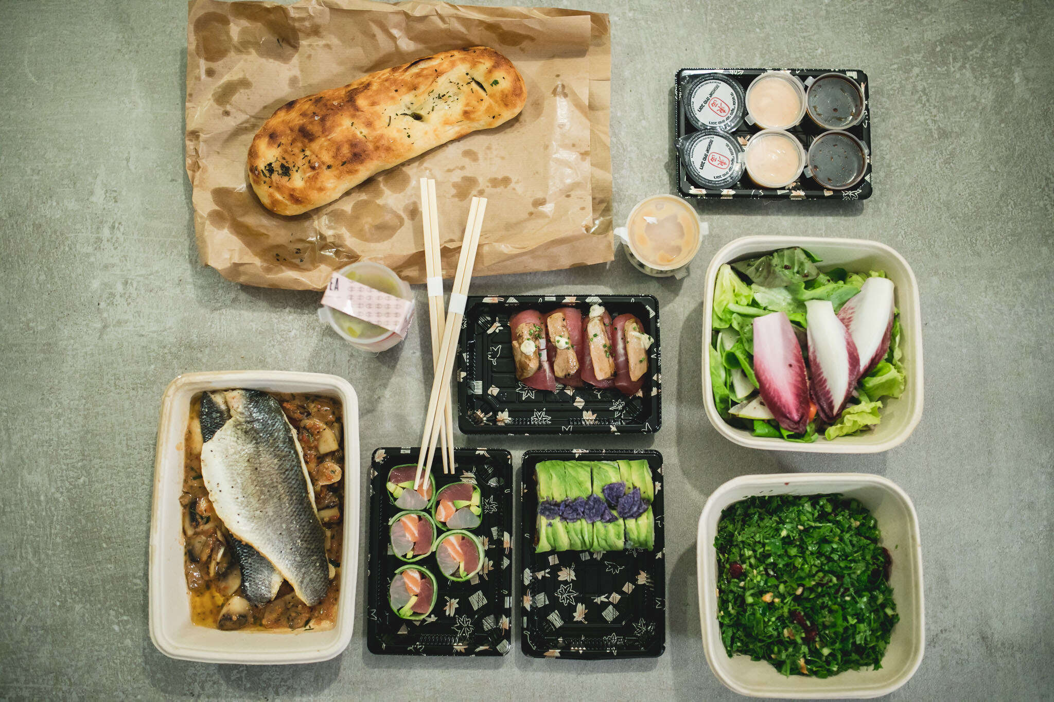 לצד הדג כיכבו שלוש מנות ראשונות – סלט עשבי תיבול ירוקים שהיה חמצמץ במידה, ועם כמה שהוא נתקע לנו בלי סוף בשיניים, נהנינו מאוד מהפרשיות שלו, אנחנו בבית, את מי כבר יש לנו לפגוש. לצדו סלט אנדיב עם פירות וגבינה כחולה ברוטב חמאת בוטנים שהיה רענן ועם שילוב מושלם של מלוח ומתקתק, ופוקצ׳ת הבית שהגיעה חמה ושמנונית כמו שפוקצ׳ה ביתית צריכה להיות.