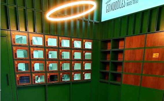 צלע אחת- אגף קורונה לשירות הלקוחות ובו אלכוג׳ל, מגבונים ושאר אביזרי ניקוי וחיטוי. ממול, שלושה מסכים גדולים המציגים תפריט דיגיטלי מזמין, נגיש וקל מאוד לתפעול ואילו הצלע המרכזית מתהדרת בקיר לוקרים שקופים הממתינים להזמנות. דרך חלונות התאים ניתן להשקיף על המטבח המתנהל ביעילות ובניקיון מופתי.