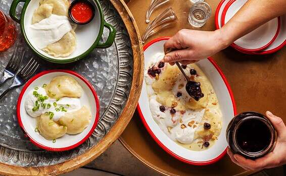 ורניקי- תפוח אדמה ובצל; כרוב מטוגן; מתוק עם גבינת דבורוג, דובדבנים ושמנת חמוצה.