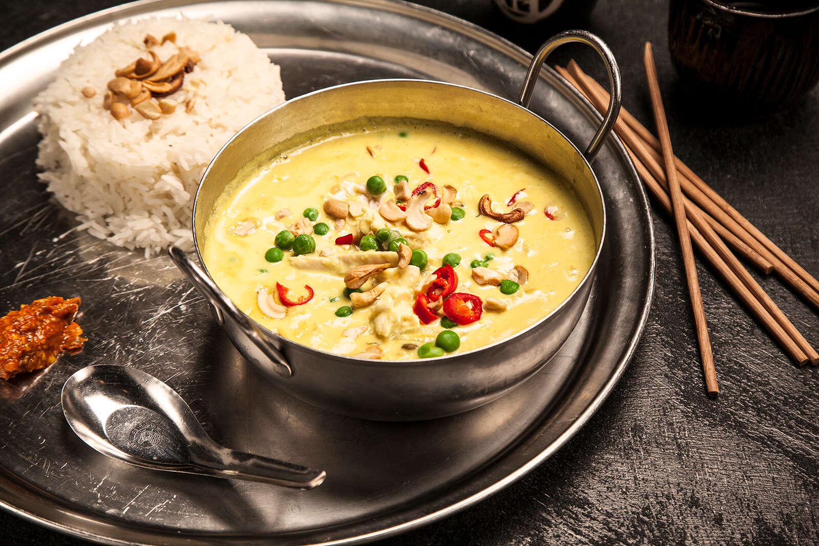 לראשונה הזמנו סום טאם – סלט תאילנדי אגדי על בסיס פפאיה ירוקה, מנה שלא משנה מה, אם היא קיימת בתפריט של המסעדה – אנחנו נזמין אותה. חגגנו על הסלט הנהדר שלא אכזב, אם כי באיזשהו שלב ליקטנו החוצה את הצ'ילי שפוזר בנדיבות רבה. המשכנו עם מנה פחות מוכרת, מלאיי כופתא – "כופתאות תפו"א מטוגנות במילוי פניר, צ'ילי ומומביי ספייס ברוטב עגבניות חמצמץ, קשיו ושקדים קלויים" וליקקנו את הצלחת. מסוג המנות שכל ביס שלה קצת שונה מקודמו, אך מאחר שמדובר במנה ראשונה, היא משאירה הרבה טעם של עוד.