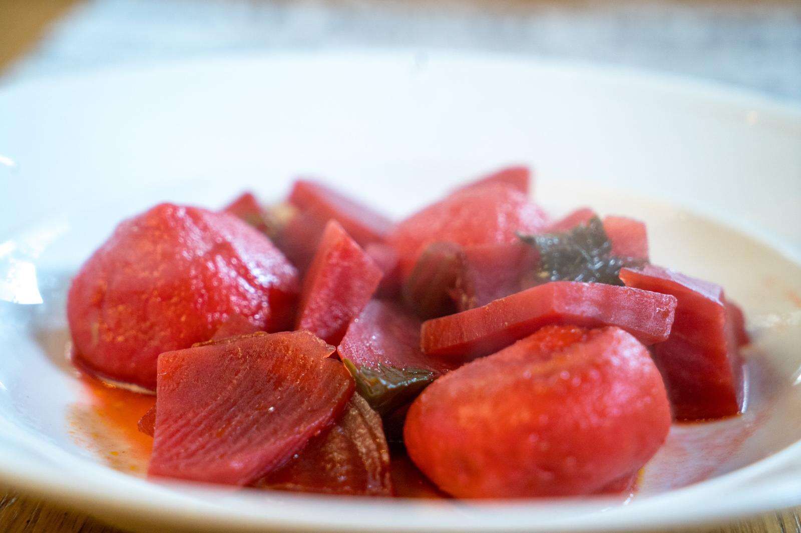 פתחנו את הסעודה עם החומוס של רחמו, שבניגוד לחומוסיות אחרות בבירה ומחוצה לה משמר עדיין את הטעם החמצמץ של החומוס הפלשתיני לפני שהותאם לחך הישראלי. החומוס של רחמו טחון דק עד למרקם עשיר, והגרגרים שמתלווים אליו נימוחים בדיוק כמו שגרגרי חומוס צריכים להיות. מה נשתנה משנות ה-50? כלום, וטוב שכך.