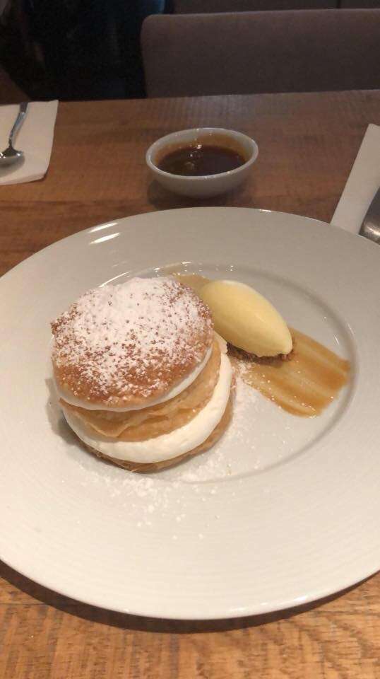 מפוצצים אך מרוצים, חלקנו קינוח שהתברג לחמישיית הקינוחים הטובים בארץ לעניות דעתי, המילפיי של טוטו. המילפיי הוא אינטרפרטציה לעוגת נפולאיון (או הקרם שניט) המפורסמת. בצק עלים קראנצ׳י ממולא בקרם קסום ומוגש עם רוטב טופי מתוק ונהדר, לצד כדור גלידה קטן, השילוב יוצר ביחד את הביס המושלם.