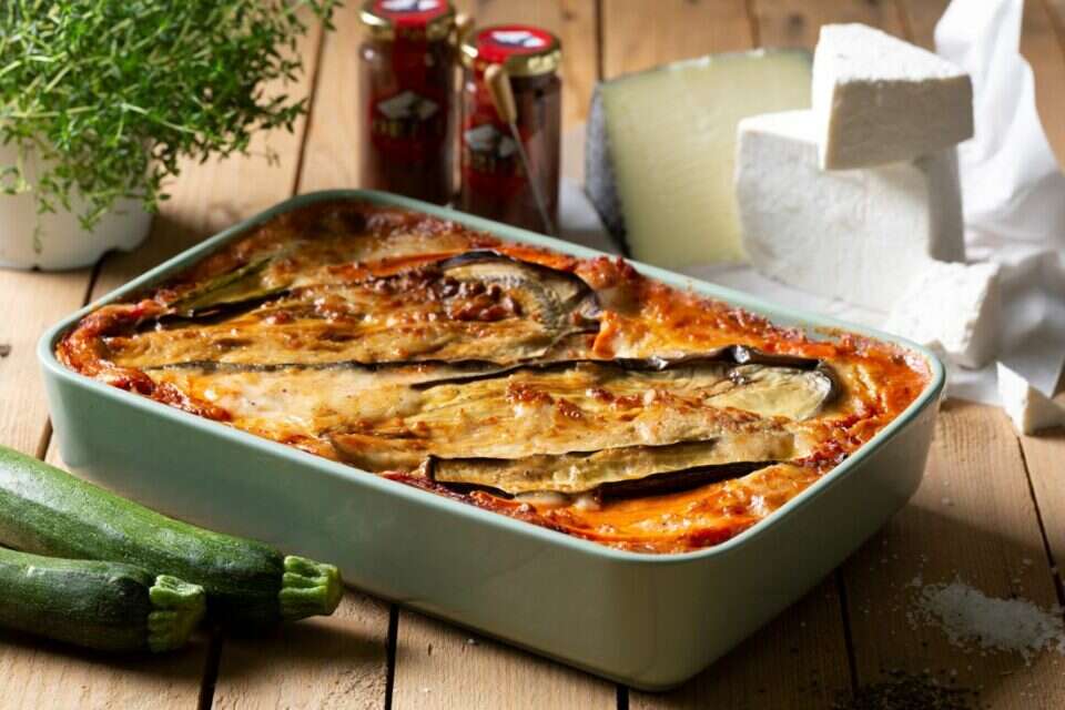 4. על הרוטב מניחים פרוסות חציל, בטטה, קישוא, מעט אנשובי, ושליש מכמות גבינת הקאשקבל וגבינת הפטה.