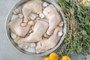 1. מסדרים בתבנית את העוף, המשמשים, הבצלצלים, השום והמרווה.