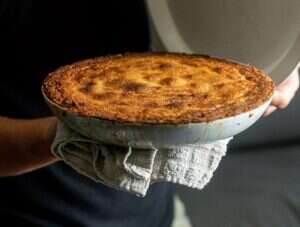 6. דוחסים מעט את הבצק כלפי המשמשים, עוברים בסכין לשחרר את הדפנות, ולאחר מכן הופכים בזהירות ובנחישות על צלחת הגשה.