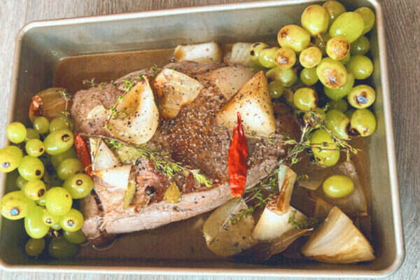 4. לאחר מכן מוסיפים את אשכול הענבים וצולים למשך כשעה נוספת. בתאבון!