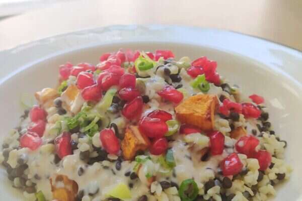 לאחר ההגשה לשפוך את רוטב הטחינה על הסלט ולקשט ברימונים.