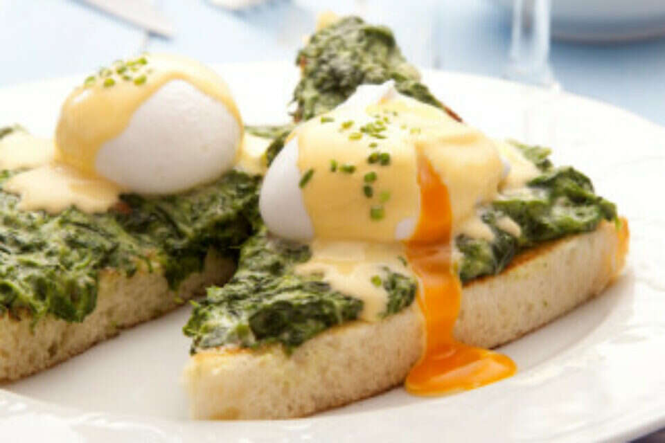 ארוחת הבוקר הקלאסית מניו יורק: ביצים עלומות על לחם בריוש קלוי עם רוטב הולנדייז