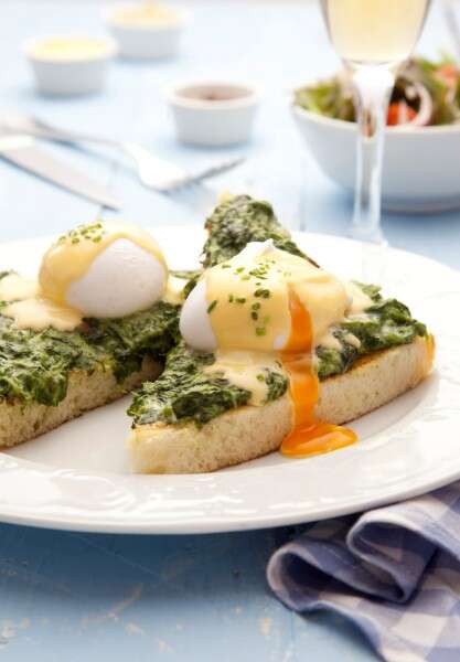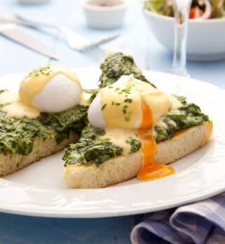 מניחים 2 פרוסות מהבריוש, על כל אחת מהן כף תרד גדושה. מניחים ביצה עלומה מעל כל פרוסה ומסיימים במזיגת כף רוטב הולנדייז על כל ביצה וקישוט סופי של עירית קצוצה מעל.