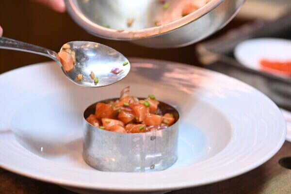 במרכז הצלחת מציבים רינג (טבעת מתכת). ממלאים את הרינג בנתחי הסלמון ומהדקים עד מילוי הטבעת. מכסים בכף קוויאר סלמון.