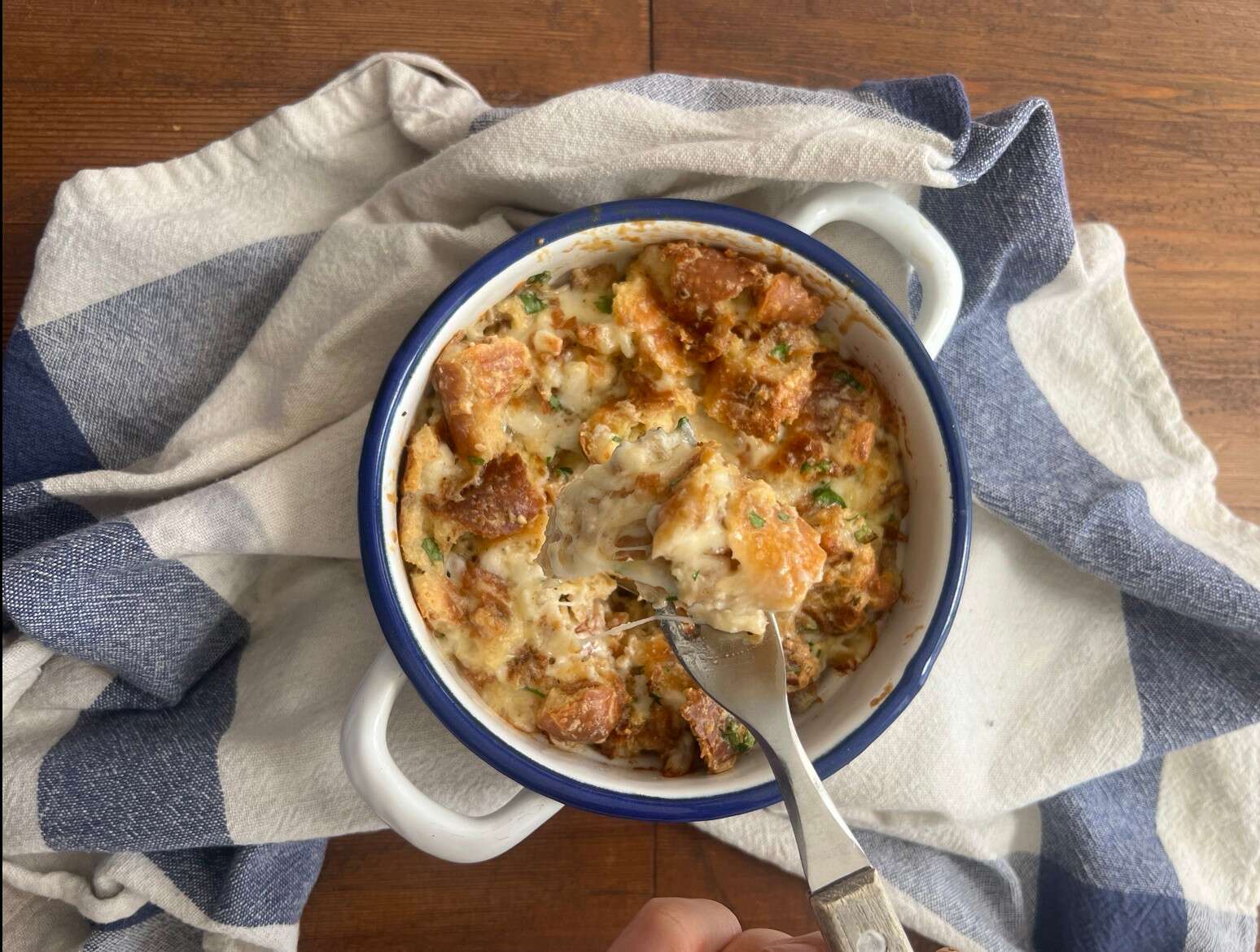 2. מערבבים ביצים, שמנת לבישול ויוצקים על הלחם, מניחים לו לספוג את הנוזלים למשך כ-10 דקות.