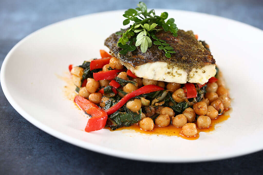 מתכון לדג מוסר בעשבי תיבול על מצע תבשיל מנגולד וחומוס