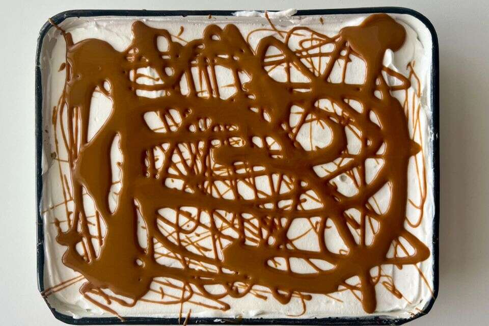 6. מחממים במיקרו במשך כ-20 שניות את ממרח הלוטוס וזולפים אותו מעל הקרם הלבן.