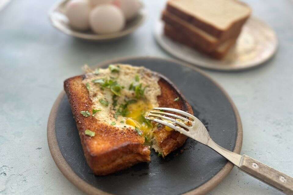 - הופכים את הכריכים, מוודאים שיש מספיק חמאה במחבת ומיד יוצקים ביצה שלמה לכל חור עגול.