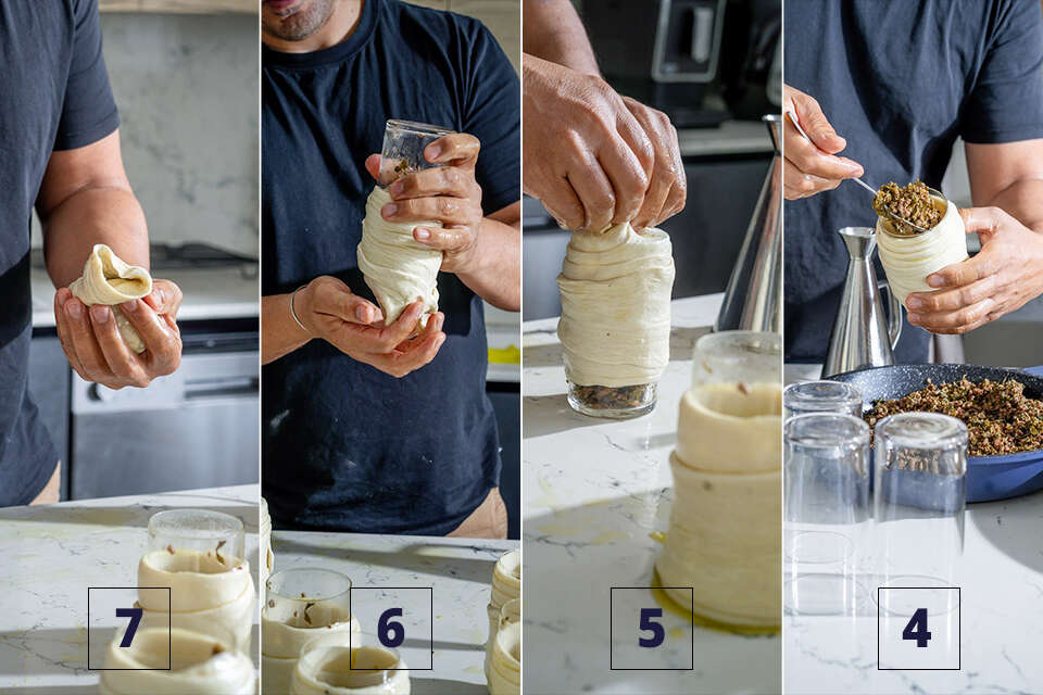 - מותחים את הבצק מעל לפתח הכוס וסוגרים את הקצוות. הופכים את הכוס כך שהמילוי נשפך לבצק, שולפים את הכוס החוצה וסוגרים את הקצוות של הבצק מהצד השני.