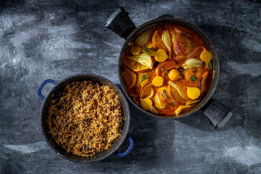 - לפני ההגשה מוסיפים את פרוסות התפוז ומכניסים לתנור חם מאוד ללא מכסה, רק להשחמה.