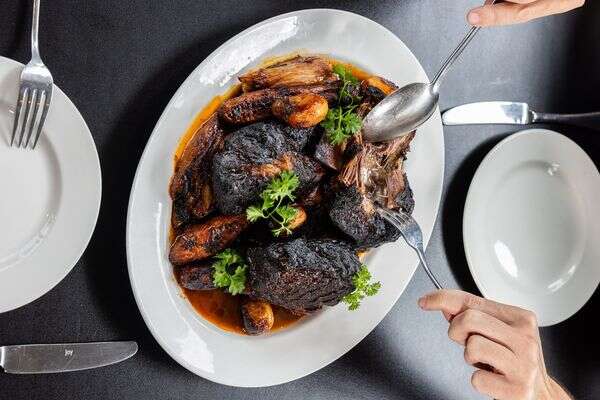 - מוציאים את נתחי הבשר מהסיר, מוסיפים כוס יין אדום, ומקרצפים את המשקעים שנותרו בסיר מהבשר.
