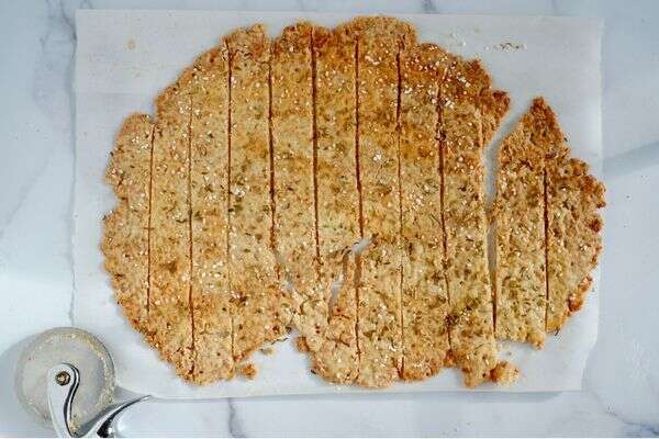 - מוציאים את התבנית מהתנור. מניחים לעוגיות להתקרר וחותכים בעזרת חותכן פיצה למקלות שווים בגודלם. אפשר גם להגיש את כל העוגיה ולתת לאורחים לשבור את החתיכה שהם רוצים.
