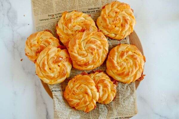 רידדנו מלבן בצק גדול, פיזרנו גבינת צ'דר על חציו האחד, כיסינו בחצי האחר, חתכנו לרצועות שוות, ליפפנו את הרצועה לצורה של בורג, גילגלנו את הבורג סביב עצמו ואת הקצה דחפנו למטה - וזהו.