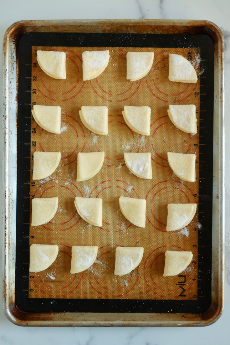 - מניחים את העיגול בתוך צלחת הסוכר ומהדקים את העיגול לסוכר. הופכים אותו ומקפלים לחצי, מהדקים לתוך הסוכר ומקפלים לרבע, מעבירים את העוגיה לתבנית. חוזרים על התהליך עם שאר העיגולים ועם שאר חלקי הבצק (ראו תמונה למטה).