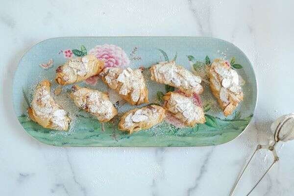 - שלב ההרכבה (עקבו אחר התמונות מטה): מוציאים עלה אחד, משמנים אותו בספריי שמן, עם האצבעות מקמטים אותו בצורת אקורדיון מהצלע הקצרה שלו. מקפלים את העלה כלפי מטה ואת שני הקצוות שלו מניחים אחד על השני - קיבלתם סוג של משולש. שמים כפית קרם שקדים בחלק התחתון של המשולש ומקפלים אותו מלמטה למעלה. צובטים קלות את הקצוות של העלה לקבלת צורה של סהרון. משמנים עם ספריי שמן (או מברישים במעט חמאה מומסת). שמים מעט קרם שקדים על הסהרון, מטביעים את הסהרון בתוך קערת השקדים. מניחים בתבנית. חוזרים על הפעולה עד שממלאים תבנית שלמה.