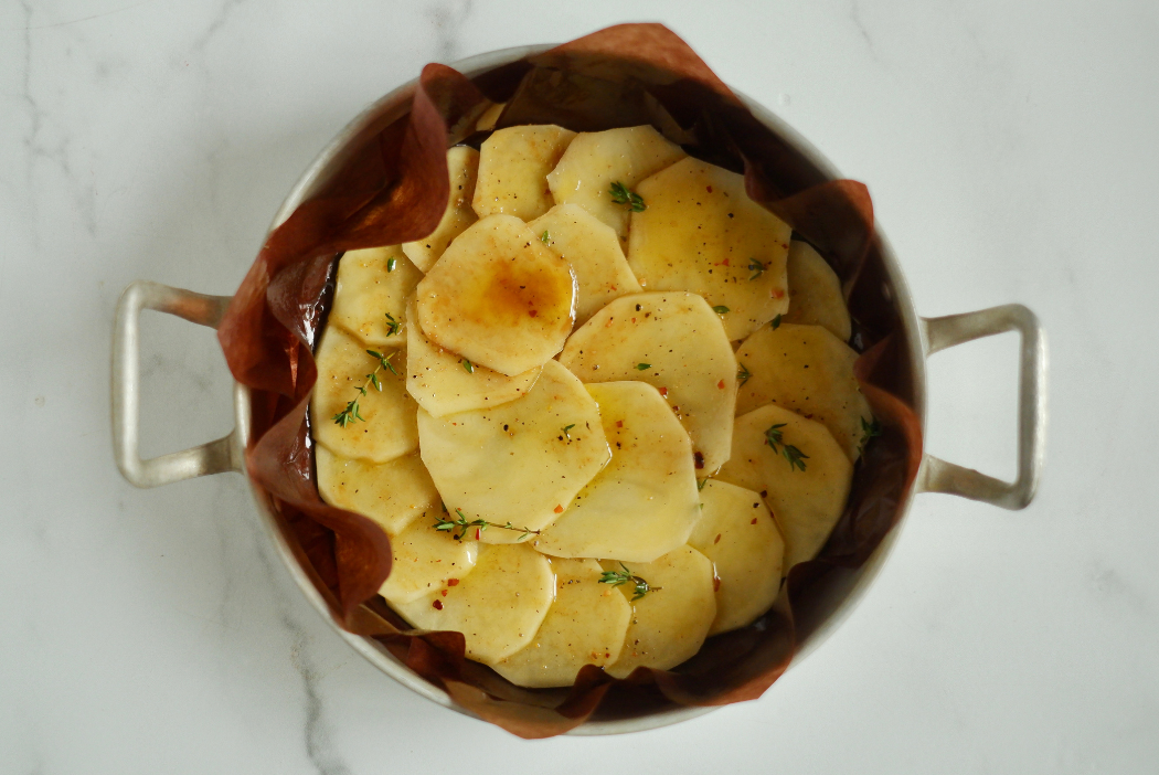 - כ-1 קילו תפוחי אדמה חתוכים דק (רצוי במנדולינה) - מומלץ להשתמש בזנים כמו ראטה, באטר, או זנים שמתאימים לאפייה