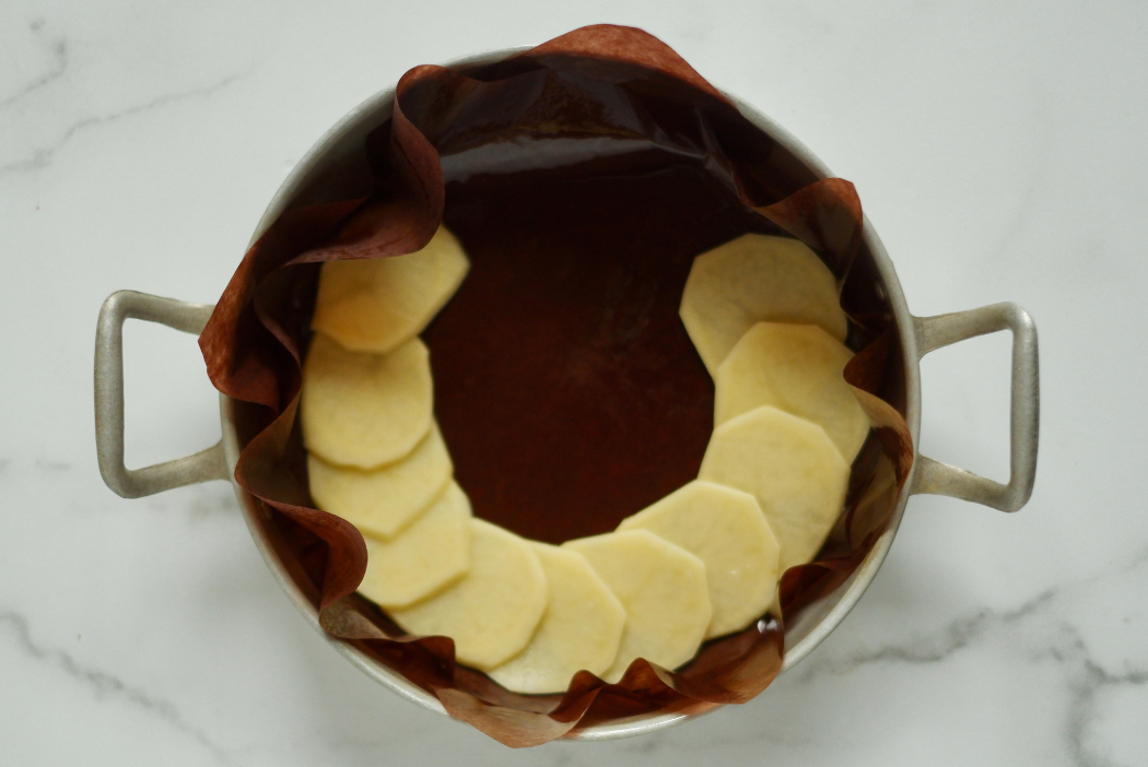 - מתחילים לסדר את פרוסות תפוחי האדמה מסביב לתבנית בצורה של "רעפים" כשכל פרוסה מכסה קצת פרוסה אחרת (שימו לב לתמונה) - ככה בונים שכבה ראשונה.