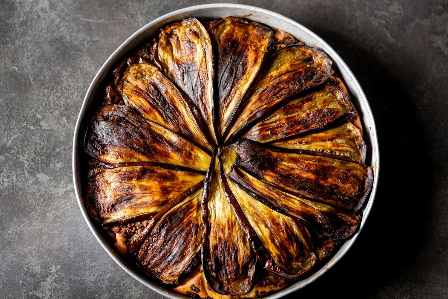 - מושחים את הבצק בשמן זית, מניחים עליו את הבשר ומסדרים את החצילים בצורת מניפה.
