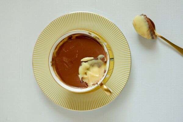 - נותנים לקרם לנוח 20 דקות בחוץ. מעבירים את הקרם לכלים שהכנו מראש ומכניסים למקרר לשעה (ללא כיסוי). כעבור שעה מוציאים את הכלים ומכסים אותם בניילון נצמד. מכניסים בחזרה למקרר לעוד 3-4 שעות או למשך לילה.