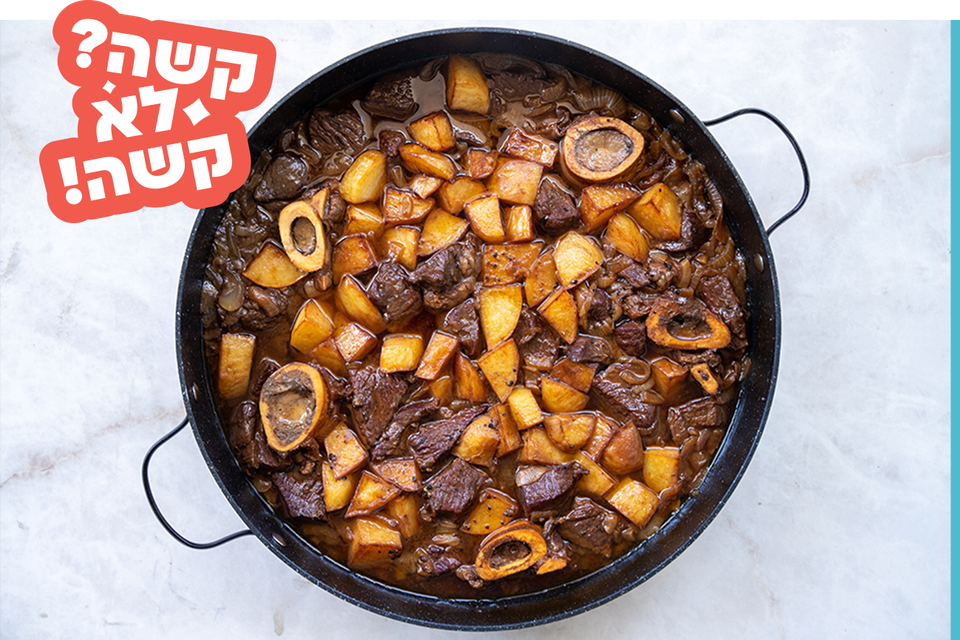 - מוסיפים לסיר את תפוחי האדמה המטוגנים. מכסים, מנמיכים את האש ומבשלים עוד כשעה וחצי על אש קטנה (המינימום הוא 3 וחצי שעות לכל התבשיל, אבל כל המרבה הרי זה משובח, ואם יש לכם זמן - מומלץ "לשכוח" את הסיר על הגז).