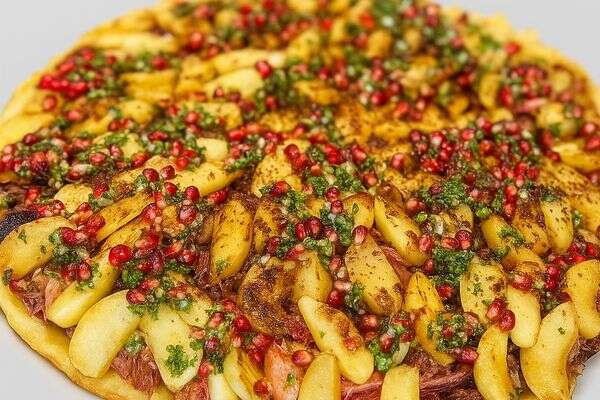 - מפזרים מעל סלסת רימונים רעננה, מזלפים מעט קרם טופי או סילאן ומגישים לשולחן.