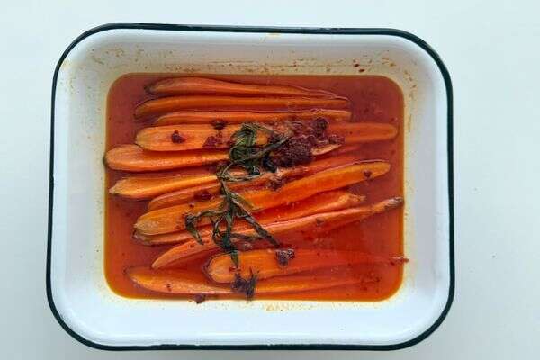 - מערבבים שמן זית, אריסה, מייפל, מלח ומים ויוצקים על הגזרים לכל אורכם. מניחים מעל גבעולי טרגון.