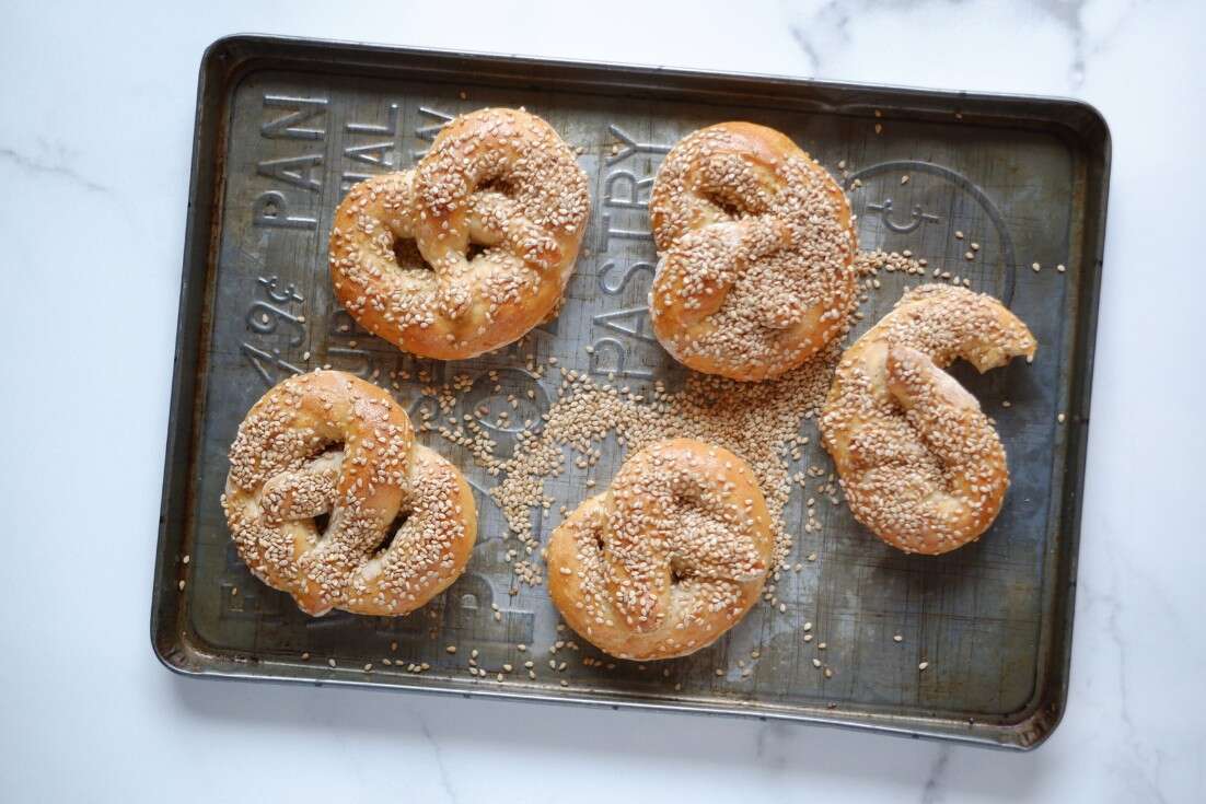 4. מברישים את פני הבייגלים בביצה טרופה/מים/חמאה או תחליפי חמאה. מפזרים מעט שומשום ומכניסים לתנור ל-20-25 דקות או עד שהבייגלים מקבלים צבע יפה. סה טו. אמרתי לכם.