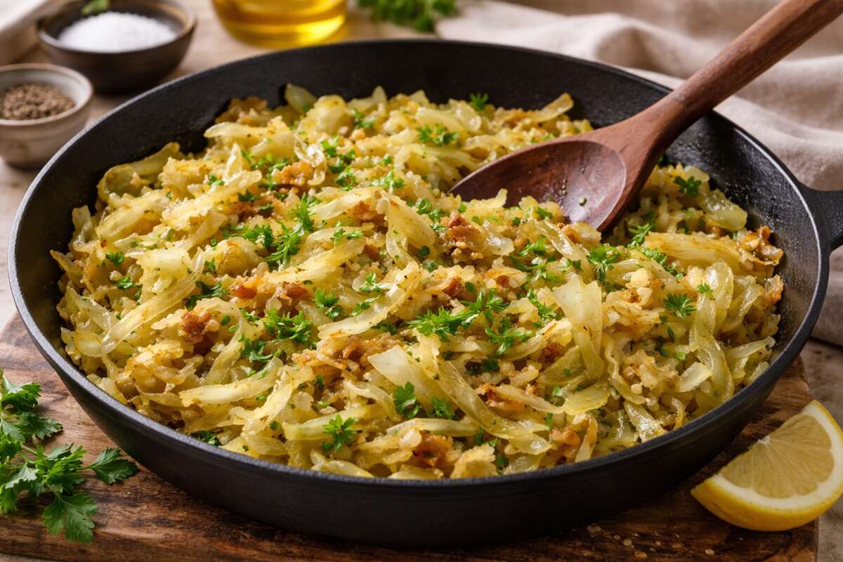 - מוסיפים את רצועות הכרוב ומבשלים 12-15 דקות, תוך ערבוב מדי פעם, עד שהכרוב רך לחלוטין ומקורמל היטב.