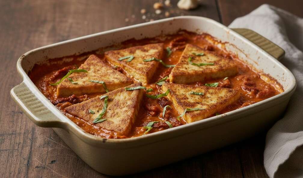ה"מארי מי טופו" הוא גרסה טבעונית למנה האיטלקית המפורסמת, עם סטייקי טופו זהובים ברוטב עגבניות ושמנת עשיר ועמוק. זו מנה חגיגית, מפנקת, שמרגישה מושקעת אבל לא מסובכת, ומושלמת להגשה על פסטה חמה או לצד לחם טוב.