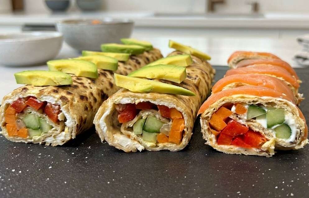 - הניחו רצועות דקות של ירקות, מלפפון, גזר, אבוקדו ופלפל צהוב. למי שרוצה להשקיע, אפשר להוסיף רצועות של סלמון מעושן או טונה.