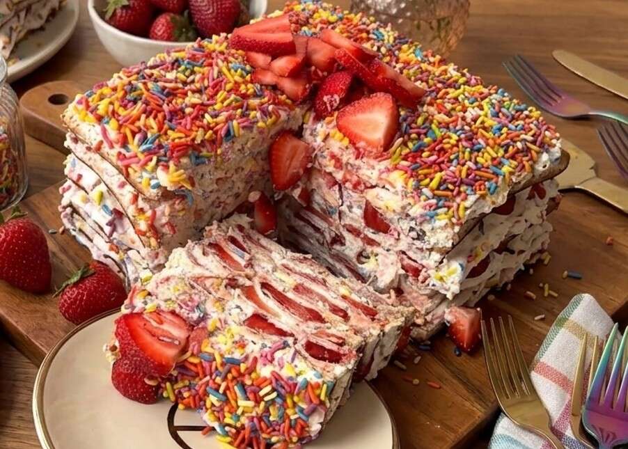 המתכון הזה לוקח את המצה הפשוטה והופך אותה לשכבות רכות של עוגת ביסקוויטים משודרגת, עם קרם גבינה עשיר, המון תותים טריים ונגיעה של סוכריות צבעוניות שמוסיפה חיוך וכיף לכל ביס.