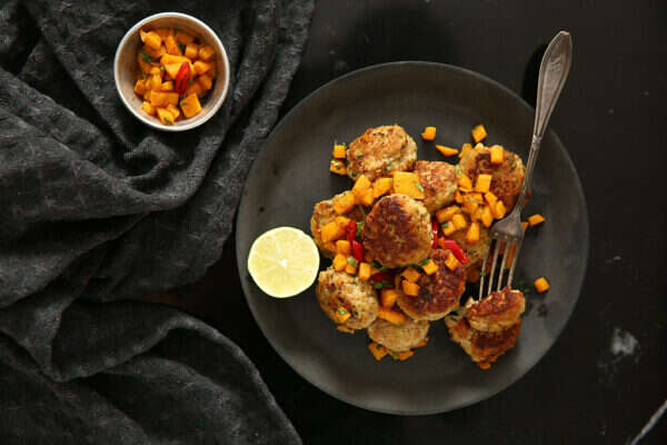4. לפני ההגשה, חותכים את המנגו לקוביות קטנטנות, מערבבים עם כל המרכיבים ומגישים את הקציצות החמות ועליהן סלסה.