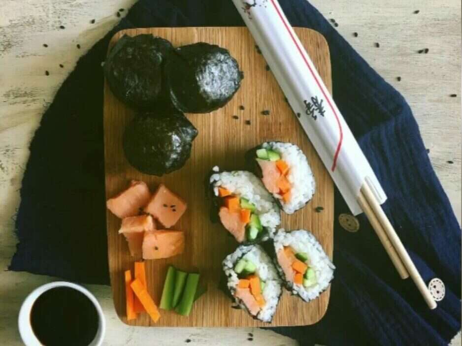 - מוסיפים כפית אורז ומהדקים. מניחים מקלוני גזר ומלפפון וריבוע סלמון. סוגרים מלמעלה עם שולי האצה ולוחצים בעדינות לתוך השקע.