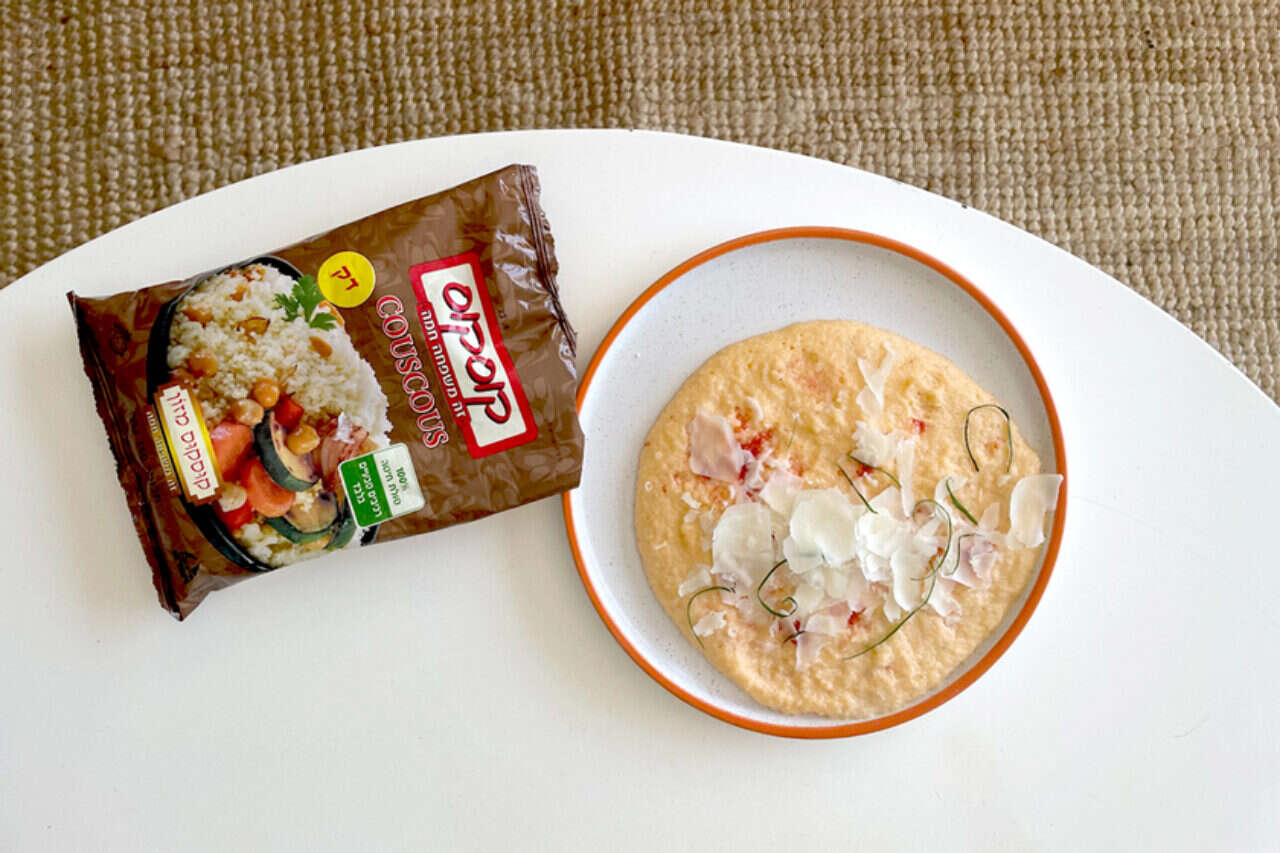 - מרתיחים שמנת וכוס חלב, ושופכים יחד עם רסק העגבניות לקערה מתאימה למיקרוגל ובה הקוסקוס.