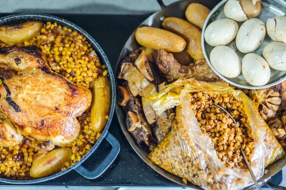 - מתבלים ומוסיפים מים עד לכיסוי, מביאים לרתיחה ומניחים על פלטת שבת או בתנור בחום נמוך למשך כל הלילה.