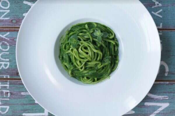 9. לתוך בלנדר מכניסי את עלי המנגולד, חצי שן שום, מצקת אחת ממי הבישול, מעט פרמז'ן מגורד, מלח ופלפל (לפי הטעם) ומיץ מרבע לימון.