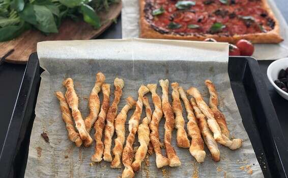 4. מניחים את המקלות המגולגלים על תבנית אפייה מרופדת בנייר אפייה.