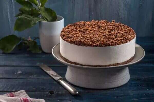 - יוצקים את התערובת על הבסיס, מפזרים מעל את השליש הנותר של הפירורים, מעבירים למקפיא לשעה ושומרים במקרר עד להגשה.