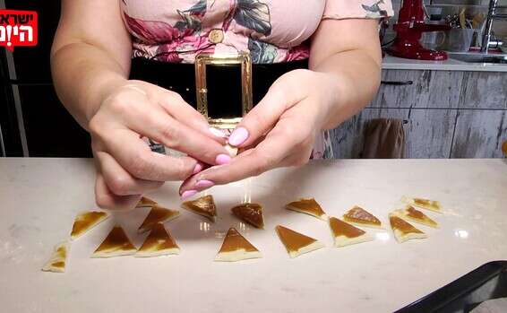 חותכים משולשים בגודל 1 ס"מ על 4 ס"מ ומגלגלים לקרואסונים.