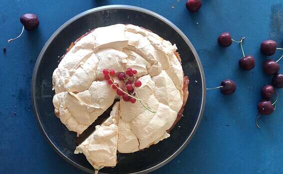 ואם כבר עוגת פרי, אז שתהא זו עוגת שזיפים של פעם, על בסיס בצק חמאתי ונימוח ומעוטרת בכתר של קצף לבן ואוורירי. בחרתי לשלב שזיפים ודובדבנים ולהעניק לה ניחוח ארומתי של סירופ שקדים.