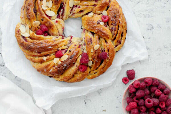 עוגת שמרים שוקולד לבן, פטל ושקדים