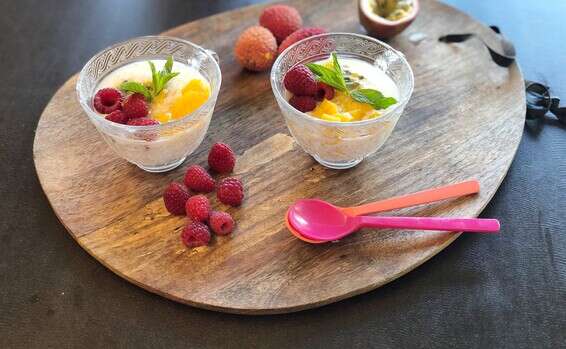 5. לקראת הגשה מערבבים את כמות הטפיוקה הרצויה עם קרם הקוקוס המתוק, מעבירים לקעריות הגשה, מקשטים בפירות ומגישים קר וצונן.