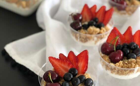 מקפלים בעדינות את שתי התערובות לקרם אחיד ויוצקים לקעריות הגשה ומקשטים בקרמבל ופירות. את בצק הקרמבל שנותר לא אפוי שומרים במקפיא.
